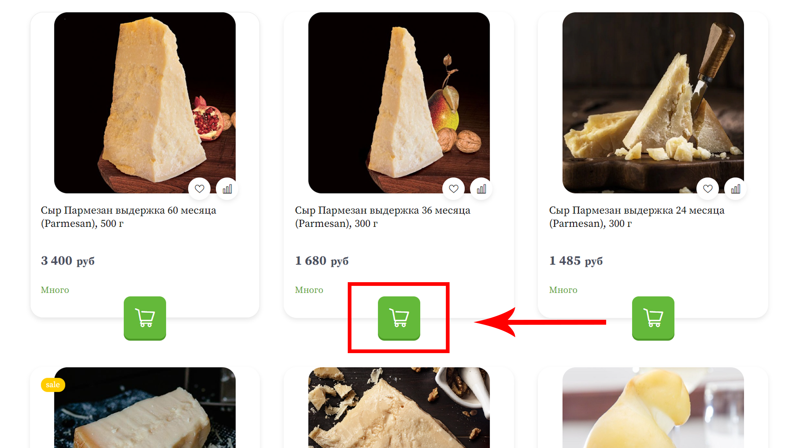 Чтобы добавить товар в корзину, нажмите на зеленую иконку.