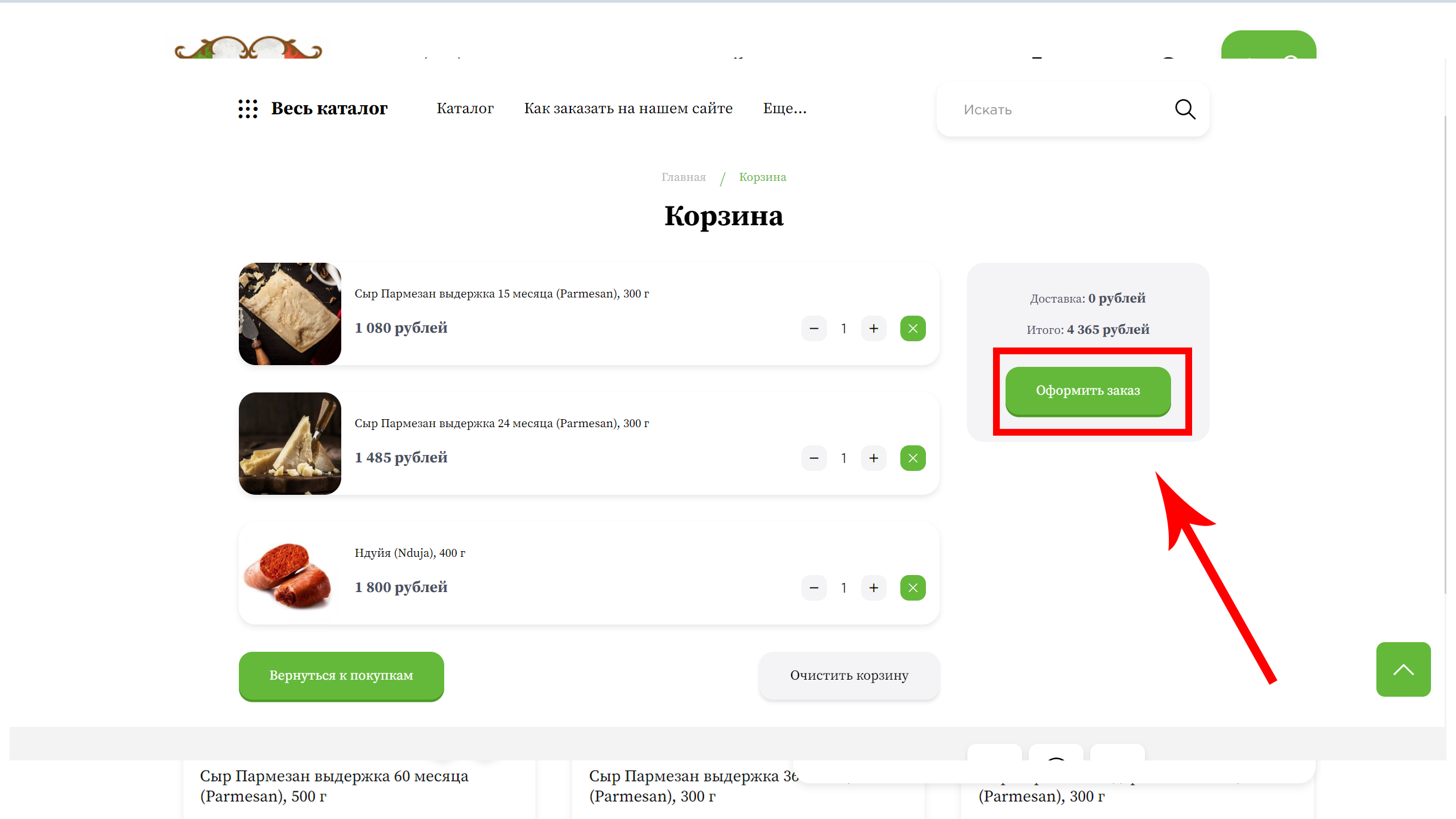 Перейдите в корзину. Тут Вы можете редактировать количество товаров или вовсе их удалить, если добавили что-то по ошибке. Чтобы перейти к оформлению заказа, нажмите Оформить заказ: