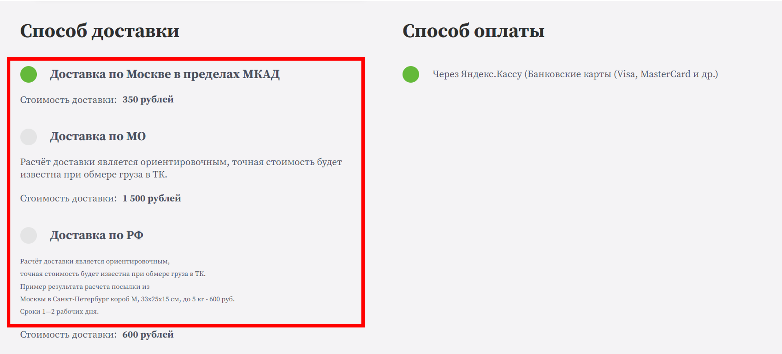 Выберите подходящий Вам способ доставки. Обратите внимание, что стоимость доставки по Москве, области и России отличаются: